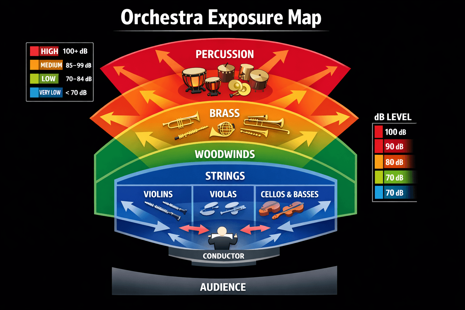 The principal oboist three rows back from the brass section. The violinist directly in front of the percussion riser. The guitarist with a monitor aimed at their left ear for a three-hour soundcheck. Exposure isn't random: it's positional. And most audiologists have never thought about where you sit.